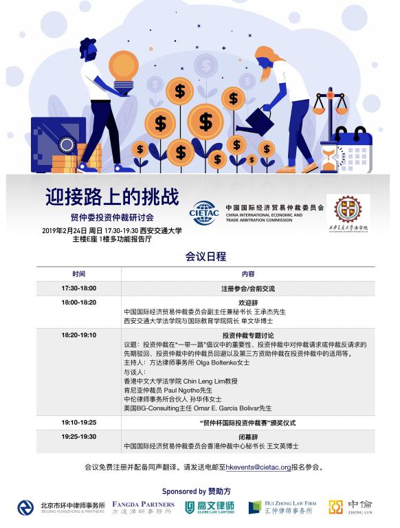 贸仲委投资仲裁研讨会暨“贸仲杯国际投资仲裁赛”颁奖仪式将于2019年2月24日下午5:30-8:00在江南官方(中国)总部主楼E座多功能报告厅举办,诚邀各位师生参加!