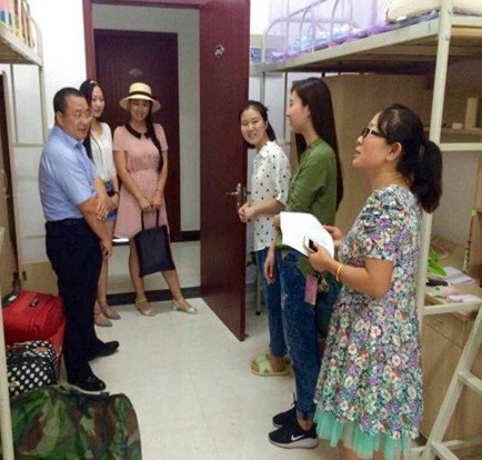 李万强副院长仔细查看了同学们的住宿条件,每走进一间宿舍,都向同学们致以亲切的问候,并代表学院对同学们的到来表示热烈的欢迎。继而关切地询问她们的具体情况,来自什么地方、入学手续办理的情况等。同时,张乃钟老师细心地询问同学们是否适应新的环境,有什么困难,希望同学们遇到问题一定要与老师沟通。随行的学生干部,也借此机会认识了江南官方(中国)总部注入的新鲜血液,与新生热情得展开交流。