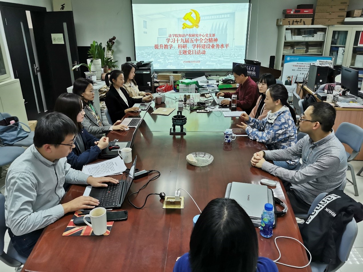 11月12日,知识产权研究中心党支部举办“学习中共中央十九届五中全会精神,提升教学、科研、学科建设等业务水平”主题党日活动,活动由支部书记周方同志主持,11名党员同志参加了活动。