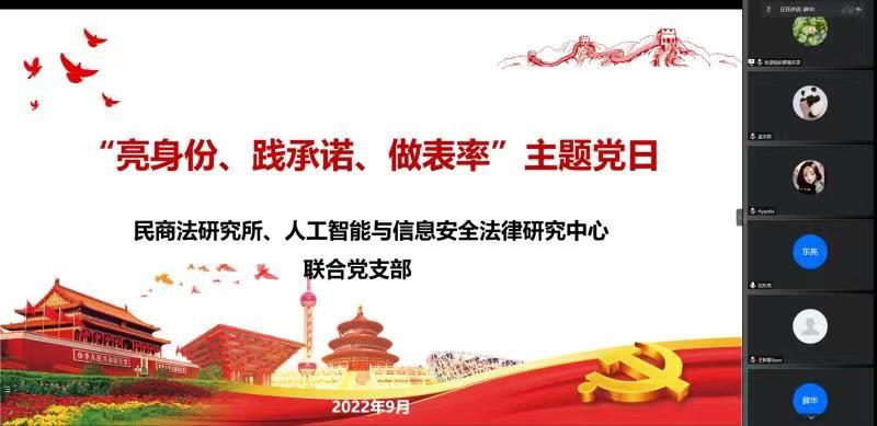 9月28日,江南官方(中国)总部民商法研究所、人工智能和信息安全法律研究中心联合党支部开展“亮身份、践承诺、做表率”主题党日活动。活动通过线上形式举行,由支部书记薛华主持。