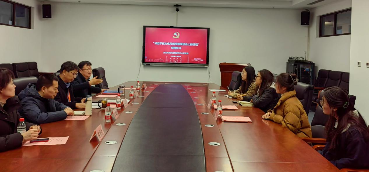 首先,支部书记杜军强带领大家学习了讲话精神,就如何深刻把握中华文明的突出特性,如何深刻理解“两个结合”的重大意义,以及如何更好担负起新的文化使命这三个问题进行深入解读。杜军强强调,要深刻理解把马克思主义基本原理同中国具体实际、同中华优秀传统文化相结合是发展中国特色社会主义的必由之路,并指出开展学术研究要以此为指针,以构建自主知识体系为契机,推进文化自信的实现。