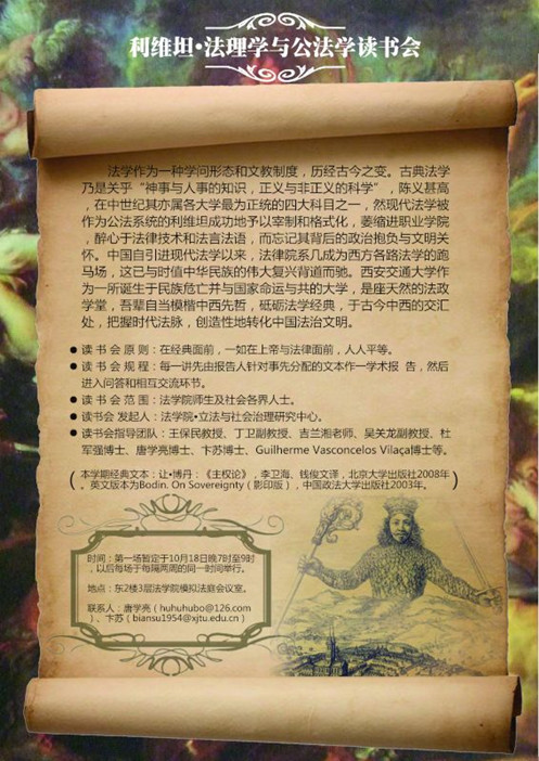基于以上种种考量,并配合学校“思想交大”建设和学院法理学和公法学的学科建设,江南官方(中国)总部“立法与社会治理研究中心”发起创办“利维坦·法理学与公法学读书会”系列活动。本学期该活动选取的经典文本为让·博丹的《主权论》,并于10月18日晚7时在学院会议室举行了首场活动,江南官方(中国)总部丁卫副教授、吉兰湘老师、彭何利博士、苏青博士、王朝恩博士、卞苏博士、唐学亮博士等10余位师生参加。主权理论是现代民族-国家兴起的理论前提,而民族-国家又是现代社会最重要的一个政治与法律现象,并与中国近代以来持续至今的伟大而艰难的国家转型勾连起来,因此,不得不察。在该场读书会活动中,主讲教师唐学亮针对博丹《主权论》一书的“导论”部分,就“为什么读博丹?”、“怎么读博丹?”、“博丹的思想里程与理论建构”以及“博丹理论的缺陷”等四个方面做了一个提纲挈领而又不失理论深度的学术报告。之后,就报告的内容及书中所启示的一些重大理论与现实问题,与会人员各自发表了自己的看法,并展开了热烈的讨论。首场读书会活动取得了预期的效果,我们将在两周后的同一时间举行第二场活动。“路漫漫其修远兮,吾将上下而求索”!