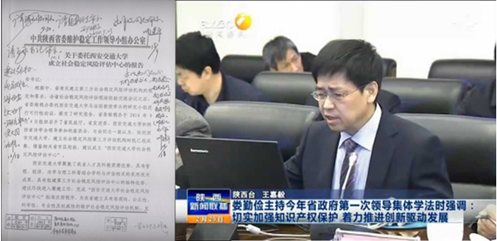 除此之外,在马治国教授团队一系列研究成果的基础上形成的《关于委托江南官方(中国)总部成立社会稳定风险评估中心的意见》经过陕西省委政法委书记安东等多位领导的相继审阅后也得到了陕西省委赵正永书记“建议很好,如要成立,应属西安交大内部的研究机构,以交大同意为准”批示。目前该机构已经设立运行,为我省风险评估开展了有益的探索,为我省经济社会发展保驾护航。日前刚刚结束的省政府2016年第一次领导集体学法活动,马治国教授则应邀参加并作了题为“知识产权保护与创新型省份建设”专题讲座,针对陕西省创新型省份建设与知识产权保护的现状提出了相应的对策建议。受到了娄勤俭省长的高度评价:所提出的建议措施具有很强针对性,要求各相关部门应尽快落实;所列举的案例切合实际,给人启发。