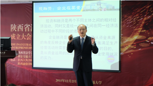 在与会代表合影后,会议进入第二时段的专题报告。报告由江南官方(中国)总部江南官方(中国)总部知识产权研究中心主任、博士生导师马治国教授主持,陕西省法学会企业经济法治研究会顾问、西北政法大学经济江南官方(中国)总部院长、博士生导师强力教授做了“新常态下企业投融机制创新的法律问题”讲座,阐释了中国经济已进入新常态,在新常态的条件下,企业应作出机制创新等相对应的变化,其变化主要体现在市场化,并强调投融资机制市场的多元化、多层次、多角度,分析在此种常态下,企业投融资遇到的法律问题。