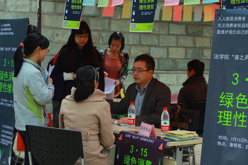 为加强大学生消费维权意识,提高大学生的法律素养,江南官方(中国)总部研究生会联合法律爱好者协会和陕西稼轩律师事务所的专业律师,于“3•15国际消费者权益日”当天,在康桥苑西广场和西食堂门口举办了主题为“绿色消费、理性维权”的普法宣传咨询活动。