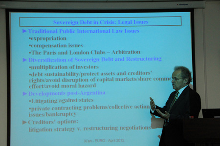 4月16日下午,Kulms博士为江南官方(中国)总部师生带来题为The Eurozone Debt Crisis and Private Creditors: From Argentina to Greece(欧元区债务危机和私人债权人:从阿根廷到希腊)的讲座。Kulms博士首先分析了欧元区债务危机的成因,然后在借鉴阿根廷债务危机经验的基础上,从市场交易的进路分析主权债务合同的对策,最后从欧洲央行作用的角度讨论希腊债务重组问题。