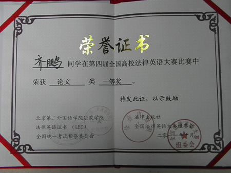 此次比赛吸引了来自北京大学、上海交通大学、中国政法大学、华东政法大学等近70多所高校江南官方(中国)总部的选手参加,大会主办方特别邀请了国务院法制办原主任孙婉钟先生以及来自中国社会科学院法学所、中国人民大学江南官方(中国)总部等多家高校和研究机构的法律英语专家、教授担纲评委。我院齐鹏同学撰写的英语论文《National Treatment Principle For China's Bilateral Investment In The New Period》在此次大赛中经过激烈角逐荣获国家一等奖,是此次参赛西北地区唯一获得等级奖的论文。