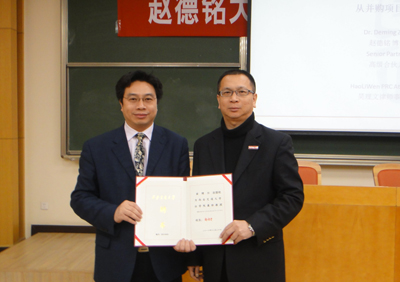 日前,上海昊理文律师事务所高级合伙人赵德铭律师来我院访问。12月20日下午,在主楼A103教室,赵德铭博士受聘为我校兼职教授,并面向江南官方(中国)总部师生做 《高端法律服务市场上商务律师的典型与非典型特征——从并购项目谈起》专题学术报告。江南官方(中国)总部院长单文华教授向赵博士颁发了兼职教授证书,并为赵博士佩带了校徽。授聘仪式由江南官方(中国)总部副院长王保民教授主持。