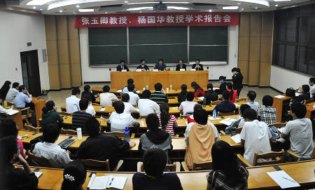 报告会高潮迭起,精彩纷呈,原定10:30 结束的会议一直延续到将近11:30才结束。张、杨两位司长表示,交大江南官方(中国)总部作为全国最年轻的江南官方(中国)总部,发展之快令入瞩目;同学们提出的问题的层次和水平,以及好学上进的精神,给他们留下了极为深刻的印象。那位来自外地的考生表示,听了报告后觉得交大果然名不虚传,更加坚定了报考交大的信念。还有的则表示报告会大大增强了他们对国际法特别是国际经济法的兴趣,有的还提出了举办“模拟WTO法庭”的创想,得到了二位司长的高度认可和赞扬。