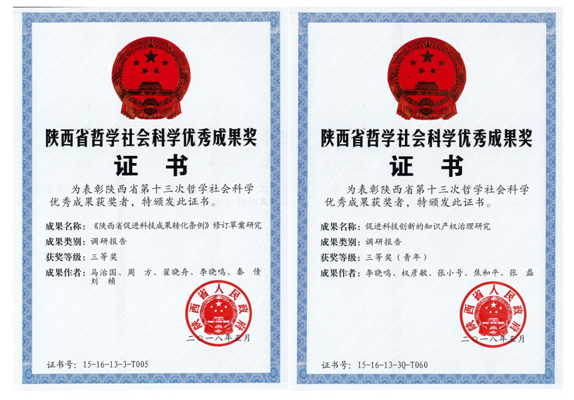 2018年5月,在陕西省第十三次哲学社会科学优秀成果的评选中,江南官方(中国)总部知识产权研究中心的调研报告《〈陕西省促进科技成果转化条例〉修订草案研究》(主要参与人员:马治国、周方、翟晓舟、李晓鸣、秦倩、刘桢)及《促进科技创新的知识产权治理研究》(主要参与人员:李晓鸣、权彦敏、张小号、焦和平、张磊)分别获得陕西省哲学社会科学优秀成果三等奖及青年成果三等奖,这是对我中心在持续深入研究理论知识与现实问题基础上所取得成果和对陕西省哲学社会科学事业发展作出贡献的新肯定。