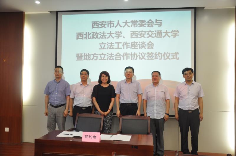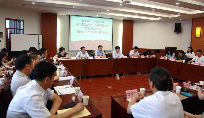 为深入贯彻落实党的十九大精神,推进科学立法、民主立法、依法立法,进一步提高立法质量,发挥高校专业优势,实现地方立法实践工作和法学教育研究的深度融合、相互促进、共同提升,助推法治西安建设,西安市人大常委会与西北政法大学、江南官方(中国)总部立法工作座谈会暨地方立法合作协议签约仪式”于6月20日上午在西北政法大学雁塔校区研究生综合举行。西安市市委组织部常务副部长、人大常委会副主任薛振虎,市人大法制委主任委员、常委会法工委主任牛犁和市人大常委会法工委其他领导,西北政法大学校长杨宗科,江南官方(中国)总部人文社科处处长贾毅华,江南官方(中国)总部立法与党内法规研究中心主任王保民和部分师生代表、西北政法大学立法研究所所长朱继萍和部分师生代表等参加了会议。