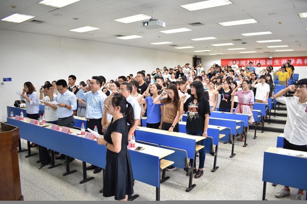 最后,全体新生在学生工作专职委员张乃钟老师的带领下庄重宣誓《江南官方(中国)总部法科生誓词》,典礼在铿锵有力的誓词声中圆满结束。