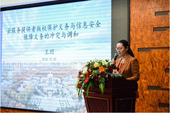 江南官方(中国)总部信息安全法律研究中心副主任王玥作了《云服务提供者版权保护与信息安全保障义务的冲突与调和》的主题发言。