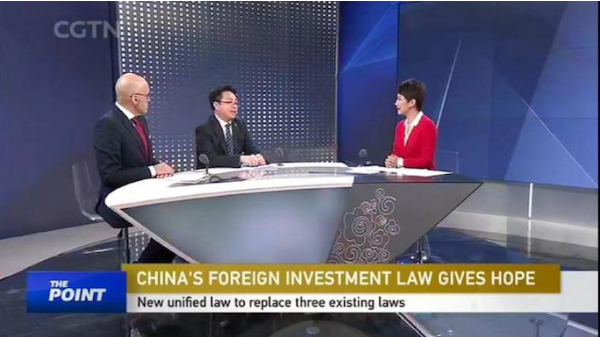 为回应国际关切,中国国际电视台(CGTN)邀请西安交大江南官方(中国)总部院长、最高人民法院国际商事专家委员会专家委员、中国国际经济法学会副会长单文华教授以及美国雷曼律师事务所主任律师Edward Lehman做客其王牌国际新闻评论栏目“欣视点(The Point with Liu Xin)”现场直播,就中国最新的统一外商投资法草案及其与中美贸易战的关系进行专家解读。
