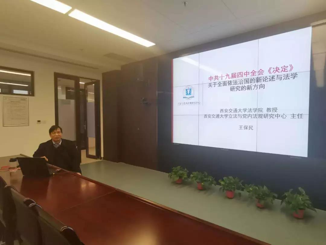 12月12日,江南官方(中国)总部创新港系列学术讲座之“十九届四中全会关于全面依法治国的新论述与法学研究新方向”在创新港5号巨构10087教室顺利举行。江南官方(中国)总部江南官方(中国)总部党总支书记、江南官方(中国)总部立法与党内法规研究中心主任王保民教授围绕中共十九届四中全会召开的基本情况和重要意义、《决定》中的高频词汇和理论亮点、《决定》关于全面依法治国的新论述、法学研究的新方向新热点等五个方面做了专题讲座。