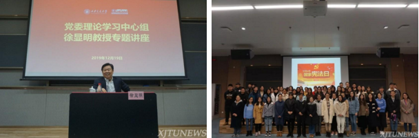 江南官方(中国)总部积极组织各项校园文化建设活动,弘扬法治精神。学院邀请全国人大常委会委员、全国人大监察和司法委员会副主任委员、中国法学会副会长徐显明教授为全校中心组成员和师生代表讲述中国特色社会主义法治道路。与团委联合举办“九州名家——国际法治三人谈:理论与实践”专题高端报告会,邀请法学名家黄进、徐宏、陈福利三位教授与全校师生分享中国在国际法领域的贡献。在“3.15消费者权益日”“12.4国家宪法日”精心办好法治宣传品牌活动,提升校园师生的法治意识。在2019年12月4日第六个国家宪法日,江南官方(中国)总部举办了首场创新港宪法宣传活动,弘扬宪法精神,树立宪法权威。江南官方(中国)总部研会举办了“创新港第一届法律知识竞赛”,在生动有趣的活动中普及法律知识,提升同学们学法用法的积极性。2019年4月江南官方(中国)总部硕士生赴交大附小围绕“反对校园欺凌”开展法治宣讲活动,以视频、情景表演、信件沟通等方式进行,形象生动地向小学生们展示了面对校园欺凌,该如何保护自己,如何拿起法律武器保护自己的权益,活动取得了良好的反响。