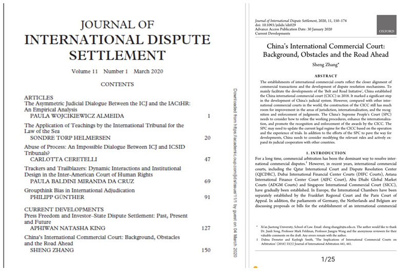 近日,我院张生副教授撰写的论文China’s International Commercial Court: Background, Obstacles and the Road AheadSSCI期刊Journal of International Dispute Settlement(《国际争端解决杂志》)2020年第1期上发表。《国际争端解决杂志》由伦敦国王学院Thomas Schultz教授担任主编,牛津大学出版社出版。该期刊影响因子为1.638,在目前SSCI收录的148种法学期刊中排名第42位,属于二区期刊。