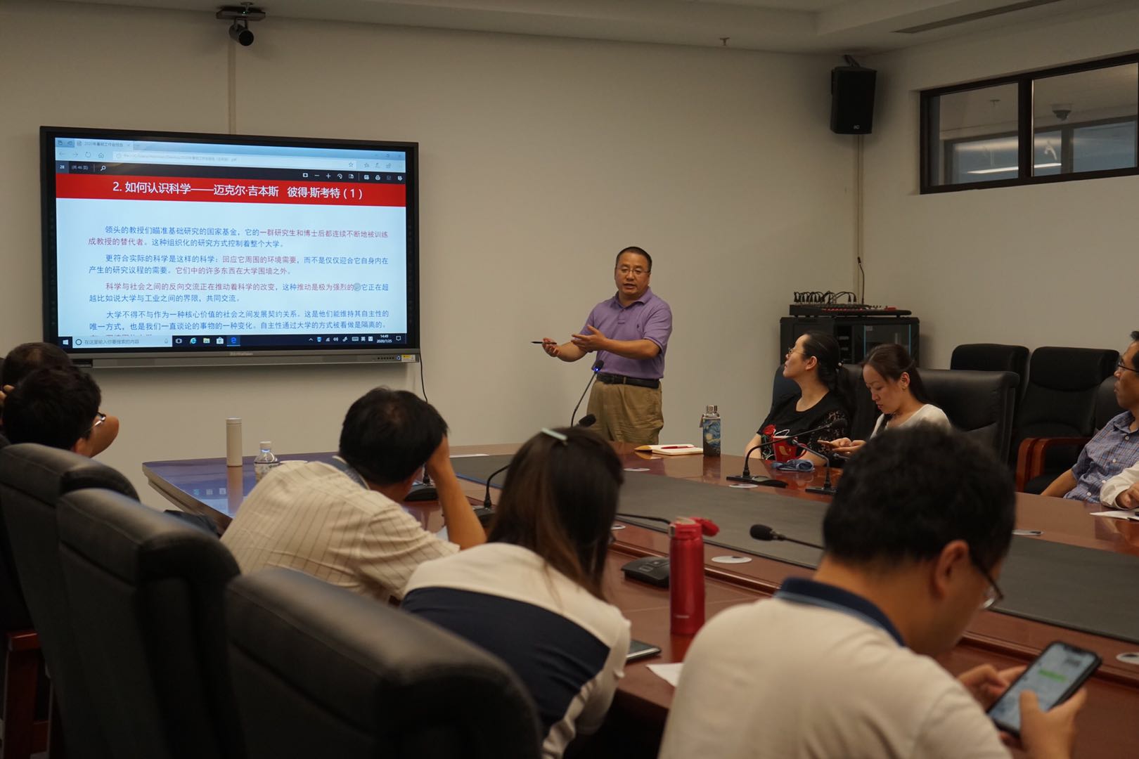 李万强副院长全面传达了王树国校长在暑假工作会议上的报告,带领全院师生回顾了学校和学院上半年在疫情防控常态化下积极复工复学,取得的良好成绩。传达了王树国校长对习近平总书记在2018年两院院士大会、哲学社会科学工作座谈会上重要讲话精神的解读和对一些学者关于第四次工业革命以及高等教育论述的思考。李万强副院长传达了王树国校长对“科创月”活动、创新港平台建设和“十四五”改革规划编制工作的布署安排。