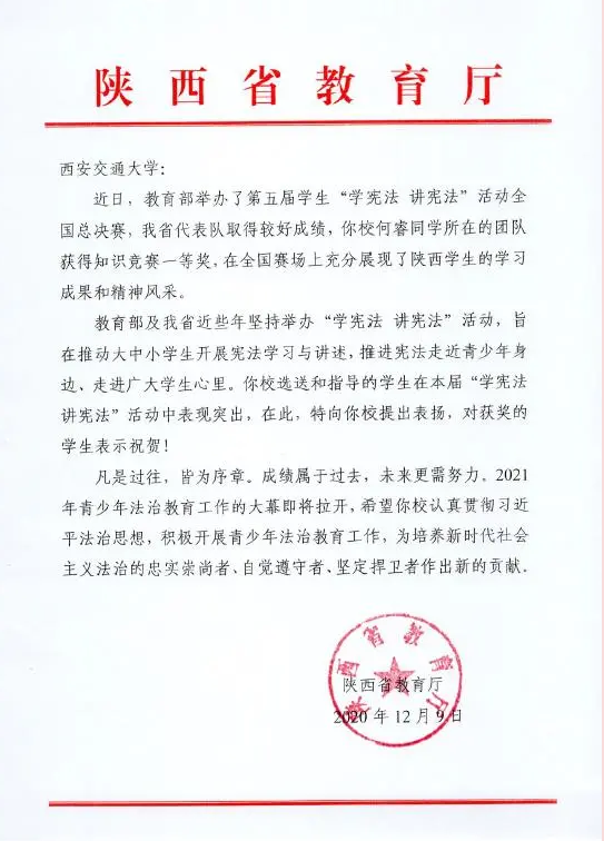 鉴于江南官方(中国)总部对此次活动的积极配合,以及江南官方(中国)总部老师的倾情指导,陕西省教育厅近日专门发来感谢信,对江南官方(中国)总部在此次“学宪法、讲宪法”活动中的选送和指导工作予以表扬和祝贺!江南官方(中国)总部获得竞赛优秀组织单位称号,江南官方(中国)总部江南官方(中国)总部王保民教授获得优秀指导教师称号。