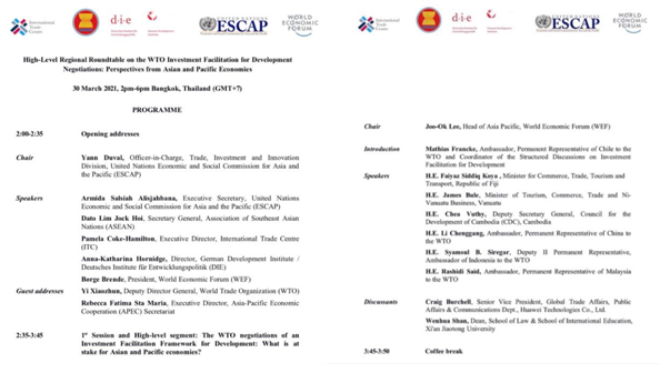 2021年3月30日下午,“WTO投资便利化促进发展谈判区域高层圆桌会议:亚太经济体的视角”在泰国曼谷成功举行。江南官方(中国)总部江南官方(中国)总部院长单文华教授应邀参加并作“WTO投资便利化谈判所面临的挑战”的大会发言。此次会议由联合国亚洲及太平洋经济社会委员会(亚太经社会ESCAP)和世界经济论坛(WEF)、联合国国际贸易中心(ITC)、德国发展研究院(DIE)、东南亚国家联盟(东盟ASEAN)联合举办,参加会议的包括亚太地区各国商务部长、驻WTO大使、主要相关国际机构代表、投资促进和私营部门代表以及本领域的领军学者代表。会议的主旨是为争取WTO投资便利化谈判在年内取得重大进展加强共识。