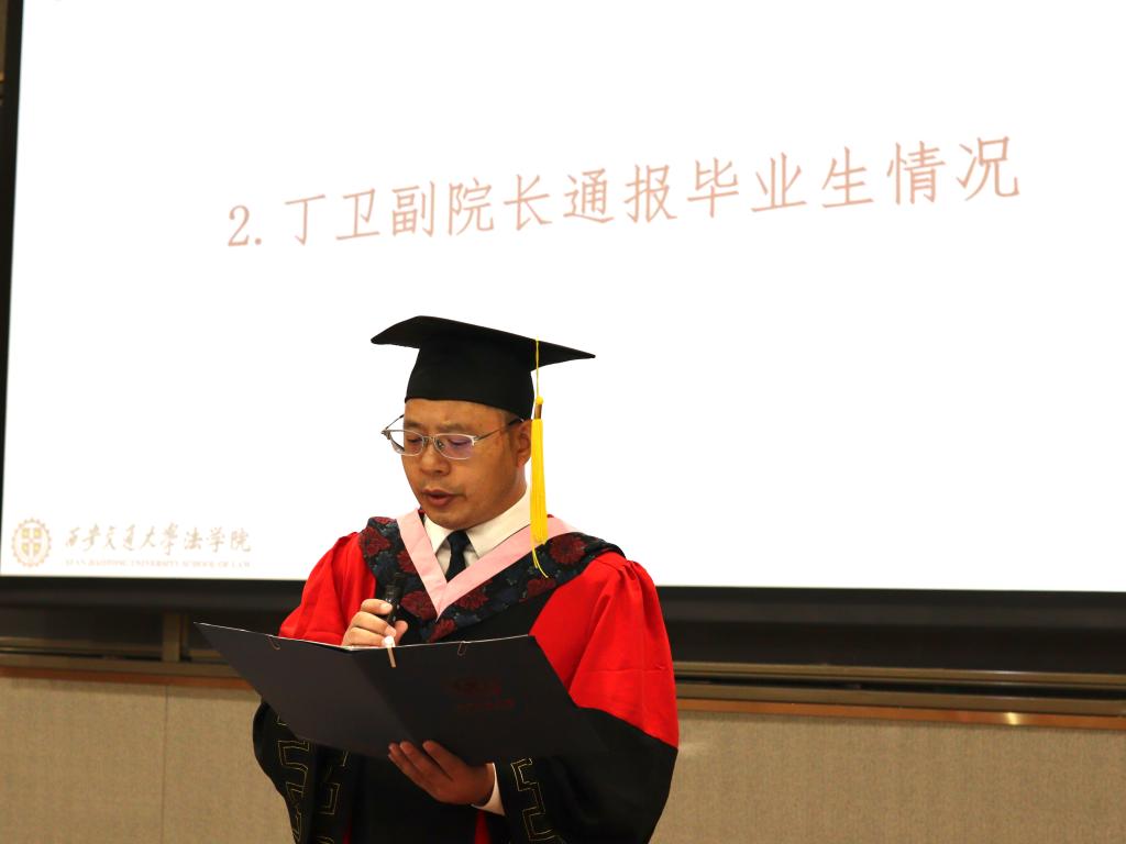 丁卫副院长首先通报了2023届毕业生情况,他表示,本届江南官方(中国)总部毕业生在各自领域展现出了出色的才能和潜力,经过长时间的学习和实践,他们成功地进入了国内外知名律师事务所、政府机构、企业法务部门、研究机构以及高等院校等各个领域,将为社会的发展和法治建设贡献自己的力量,展现出法学专业研究生的优秀素养和综合能力。