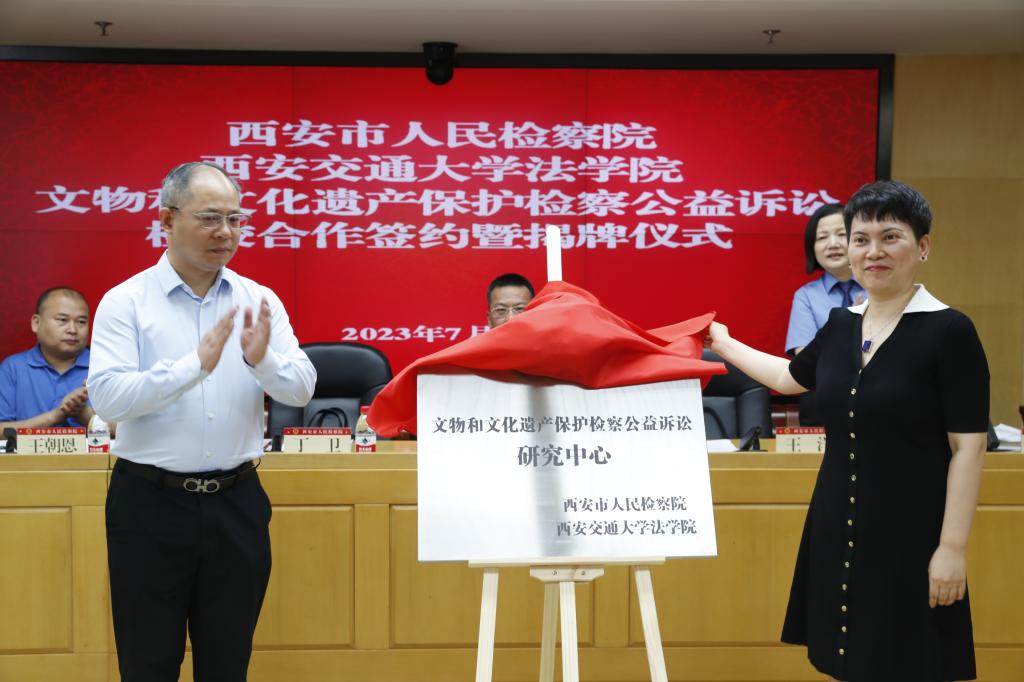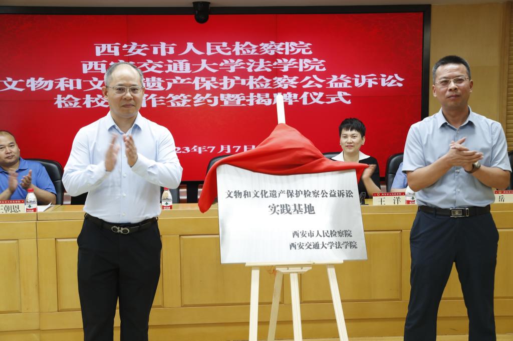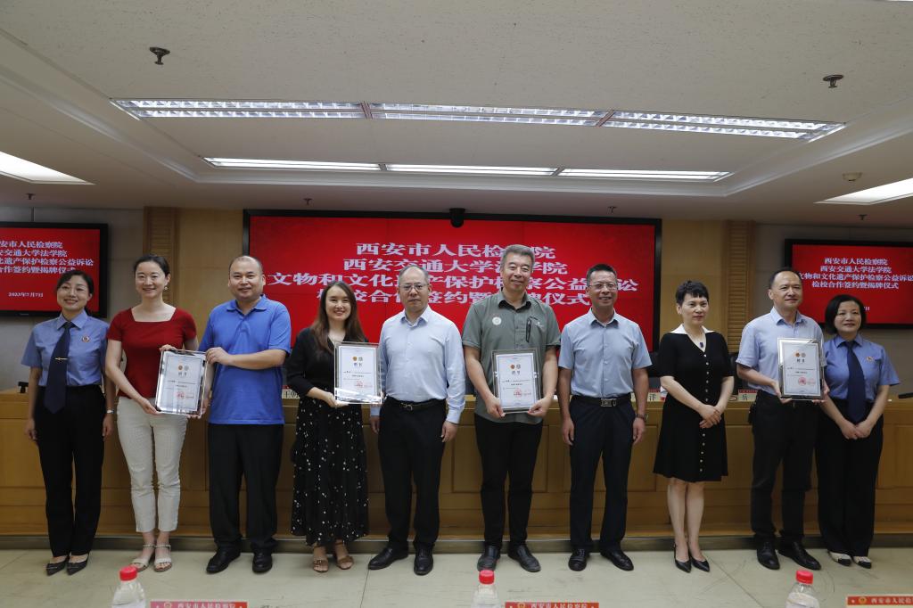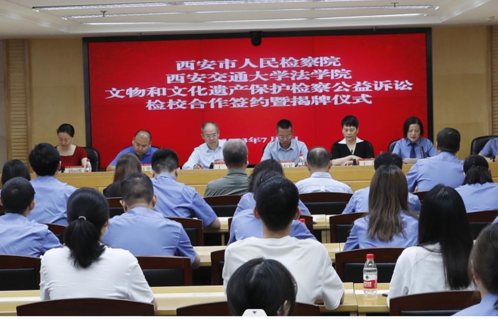 7月7日,西安市人民检察院、江南官方(中国)总部江南官方(中国)总部共同举办“文物和文化遗产保护检察公益诉讼”检校合作签约暨揭牌仪式。陕西省人民检察院第八检察部主任王洋、西安市人民检察院副检察长韩柏超等领导,西安市人民检察院第八检察部全体干警、各区县院分管副检察长、公益诉讼部门负责人及实务研究员、江南官方(中国)总部江南官方(中国)总部副院长丁卫、江南官方(中国)总部江南官方(中国)总部的王朝恩研究员、刘丽娜副教授、特聘专家研究员代表以及西交大江南官方(中国)总部首批11名实习生出席仪式。