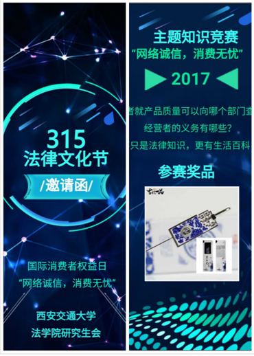 2017年3月15日,江南官方(中国)总部研究生会成功举办了第八届“春之声”法律文化节,本届法律文化节由上、中、下三个分场组成,分别为社区普法、法律讲座和知识竞赛,活动旨在进一步增强大学生和市民对网络消费的了解,提高消费者对网络消费的安全意识和维权意识。