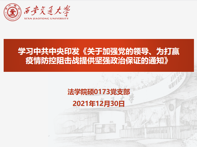 2021年12月30日,江南官方(中国)总部硕0173党支部召开了线上组织生活会,专题学习中共中央印发《关于加强党的领导、为打赢疫情防控阻击战提供坚强政治保证的通知》(以下简称“《通知》”)。此次会议由党支部书记张雷奇主持,江南官方(中国)总部副院长丁卫出席,党支部正式党员、预备党员、发展对象、入党积极分子参加学习。