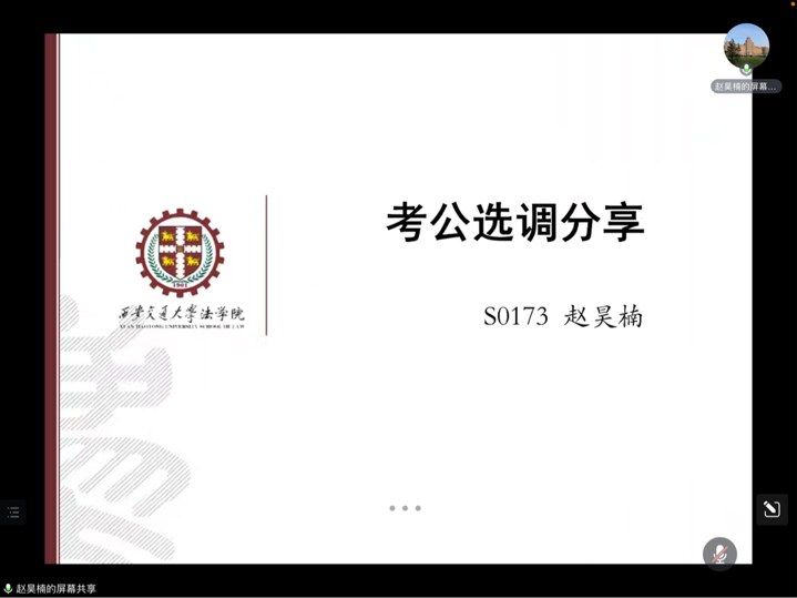 第二位分享的嘉宾是已被国家税务总局西安市莲湖区税务局拟录用的赵昊楠同学,他向同学们分享了选调考试的报名、笔试、面试等各个环节的经验。他建议同学们做好长线努力的心态建设,关注各地省情、注重日常积累和模拟练习,最重要的是通过借鉴他人经验找到适合自己的备考方案。